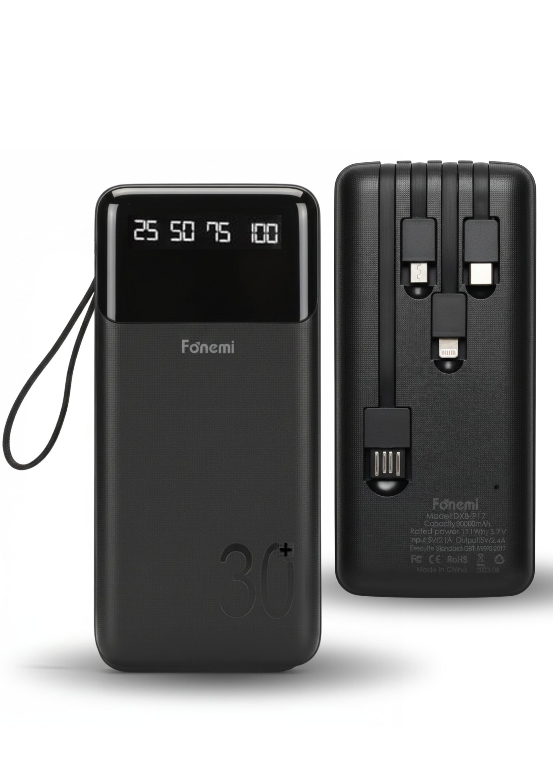 30000mAh Power Bank 22.5W Fast Charging with Built-in 4 Cables (Type-C, Lightning, Micro USB & USB), Digital LED Display, Smart Protection, Dual Input & Multi-Device Output, Portable Charger with Handle – Black
