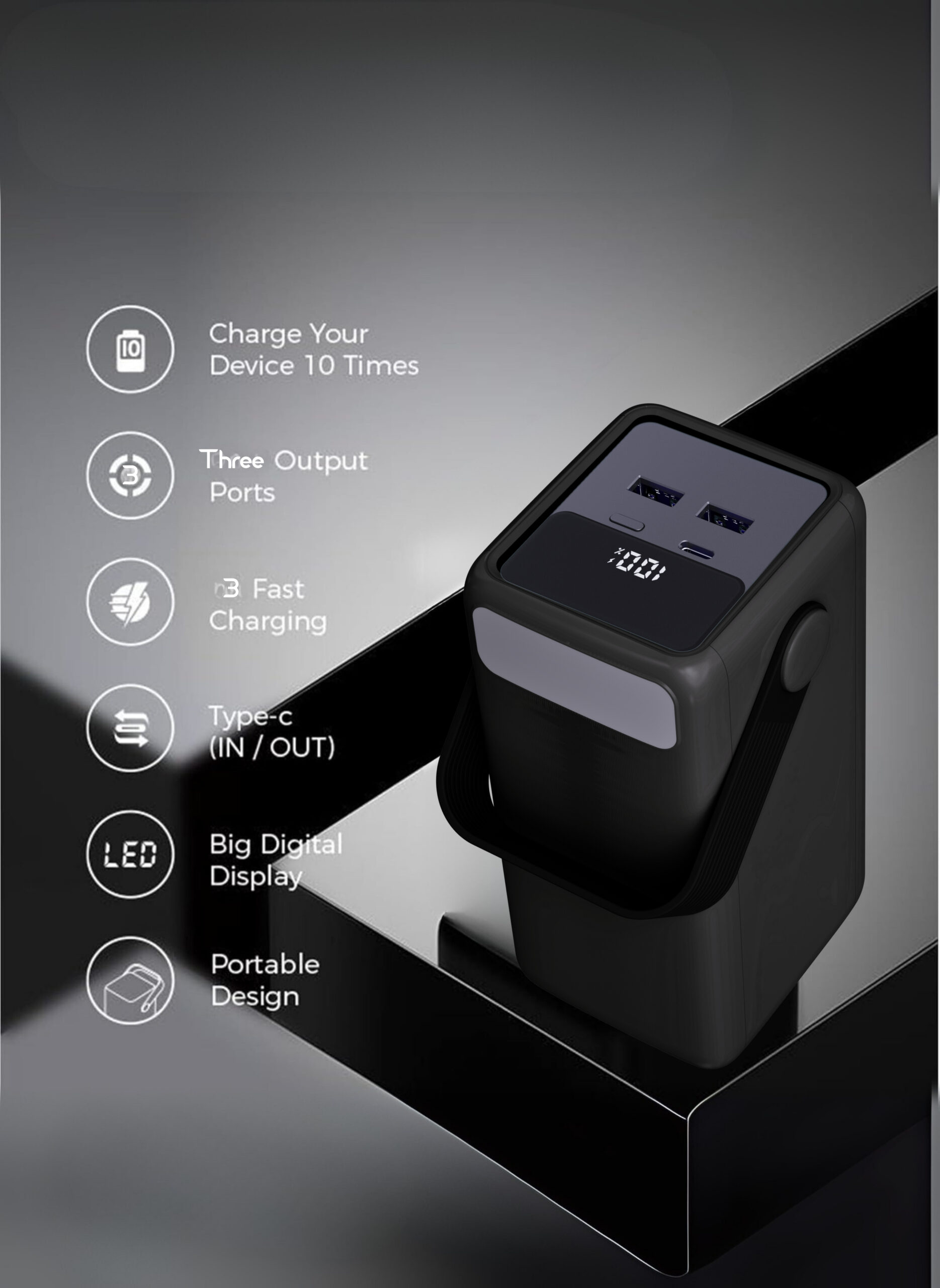 FAST-H60Pro 60000mAh Power Bank – Ultra-Large Portable Charger with 3 Built-in Charging Wires, 22.5W Super Fast Charging, Digital Display, Dual Device Output, Travel-Ready Battery