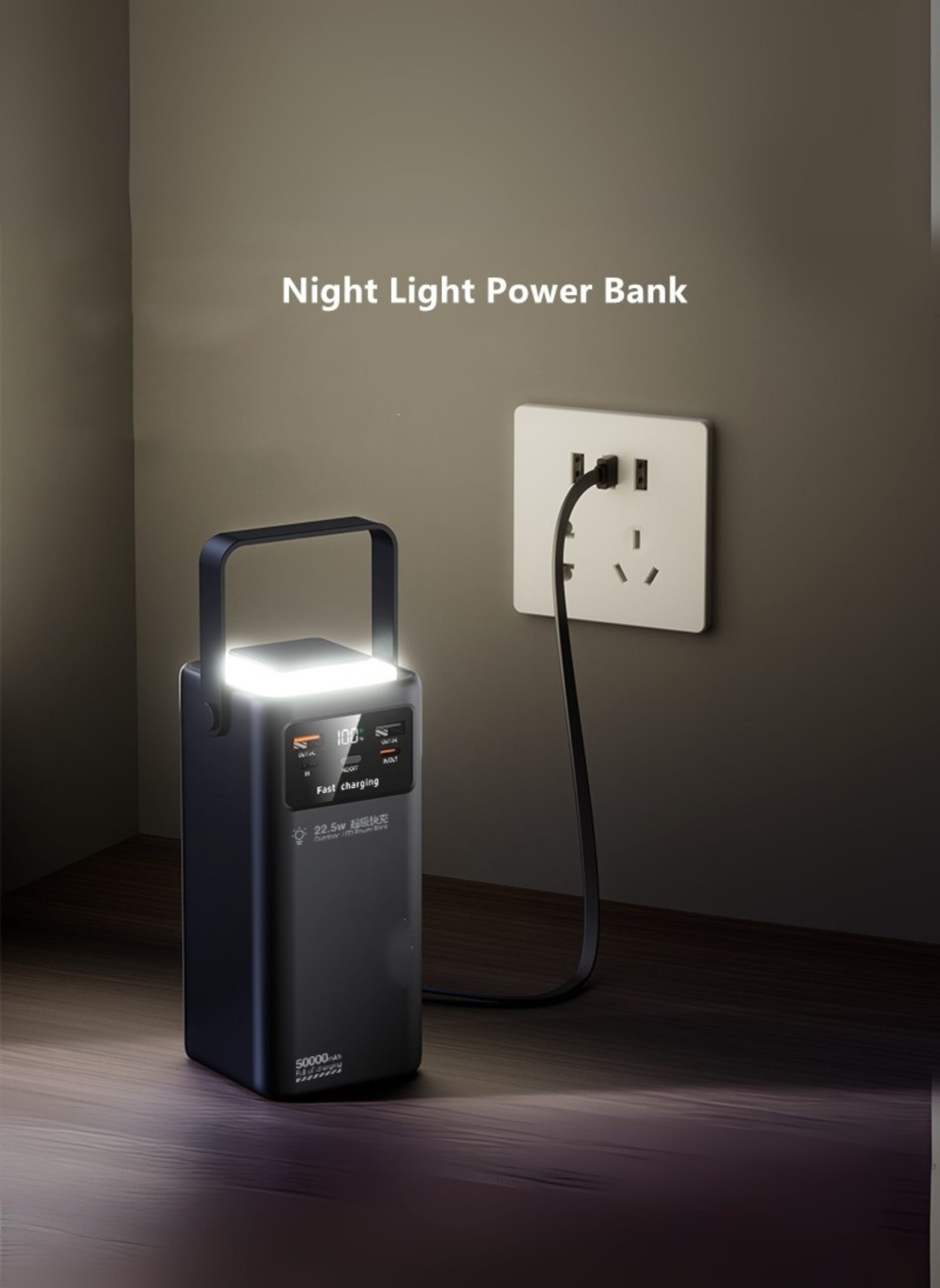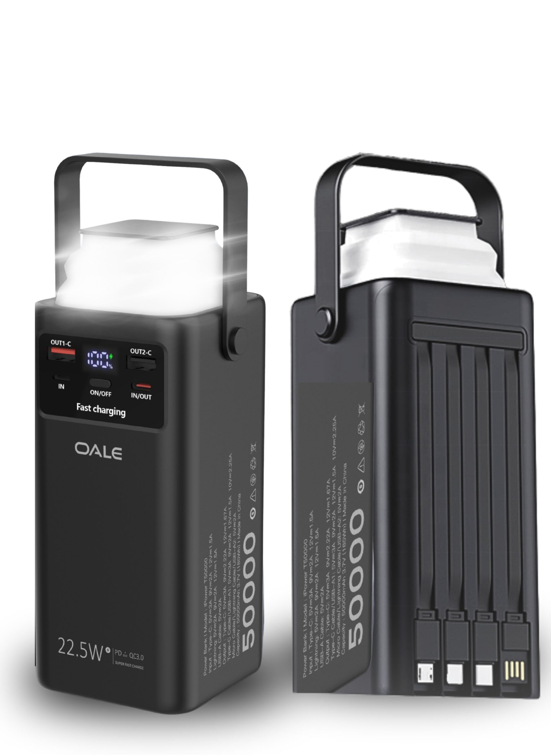 50000mAh High-Capacity Power Bank with LED Display & Camping Lamp, 22.5W PD Fast Charging, 4 Built-In Cables – Universal Portable Battery Pack for iPhone, Samsung, Xiaomi, Oppo – Black