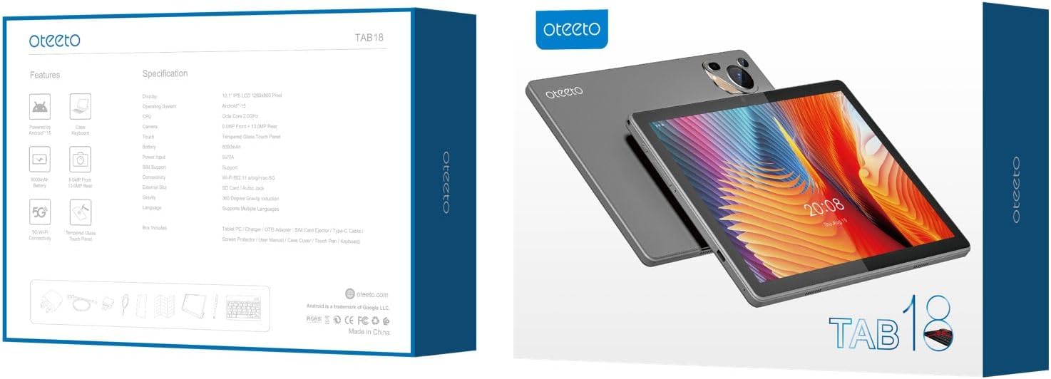 Oteeto Tab 18, 10.1-inch Android Tablet, 8MP+13MP Camera, 8000mAh Battery, Octa Core 2.0GHz, Android 15