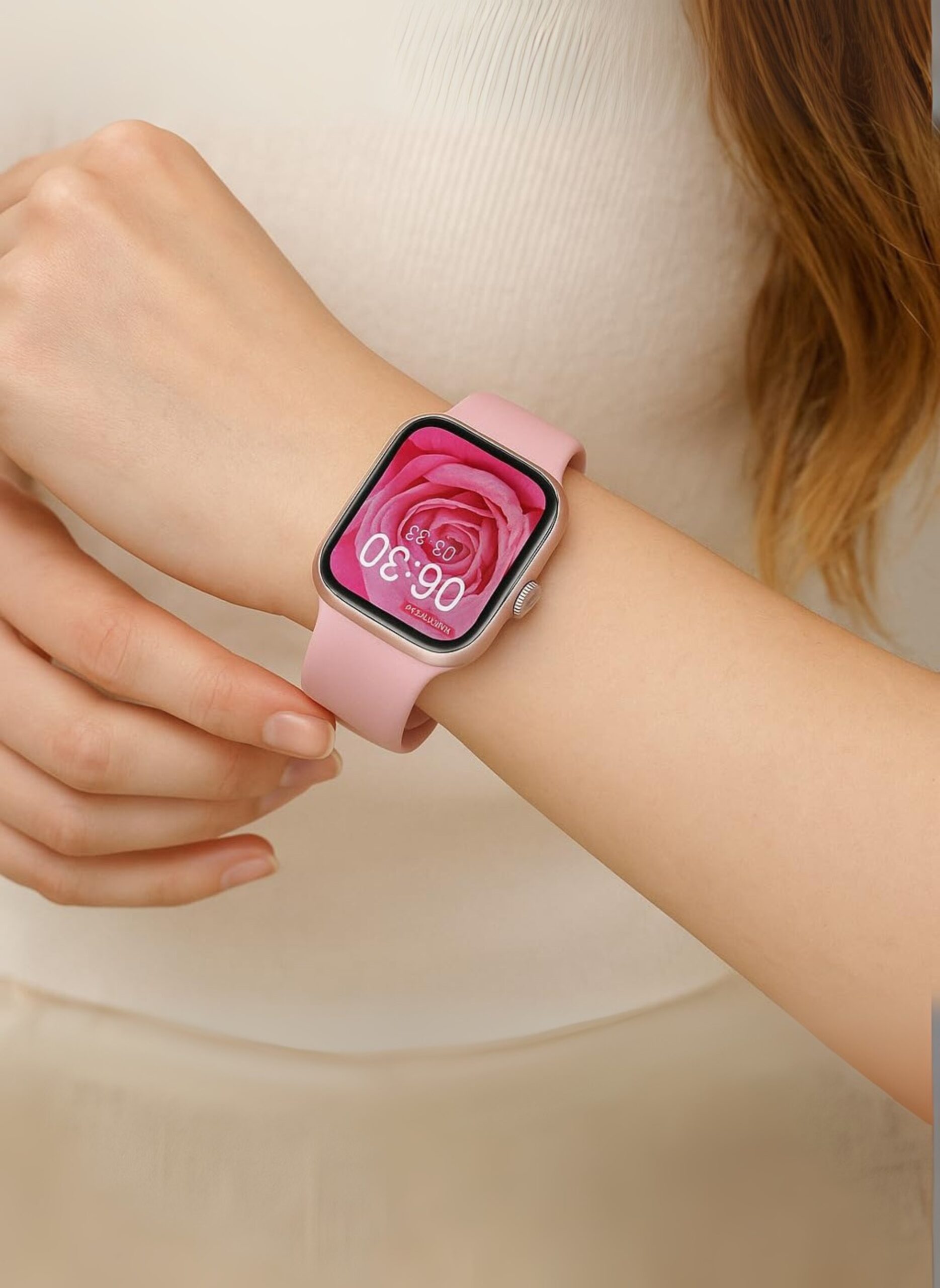 The Wisme X51 Mini Smart Watch Series 10 features a stunning 36mm AMOLED display, elegant pink design, and three soft liquid silicone straps. Designed for girls and ladies, it offers fitness tracking, smart notifications, and smooth Bluetooth connectivity with Android and iOS devices.